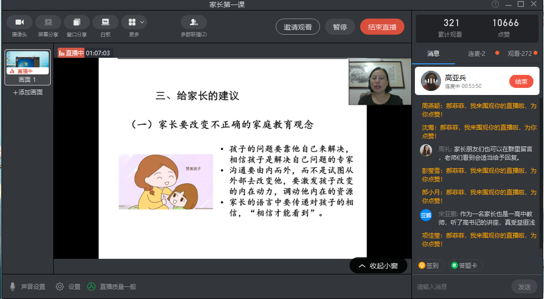 活动伊始,高教授以案例引入,告知家长大学生进入大学后的三个适应性问题:学习适应性问题、心理健康问题、人际适应性问题。其后,高教授从家庭教育入手,以教育观念、教育方式出发,告知家长如何向孩子传达相信,接纳孩子,学会倾听,给孩子的情绪一个出口,提高与孩子之间的沟通,提升有效教育质量。最后,高教授表示,家长要重视与学校的关系,彼此携手,让家校合作形成合力。听完高教授的课,宋亚鹏的家长表示,作为一名家长和高中教师,仍然觉得受益匪浅;吴泳静家长表示,暖心的学校,我们会放心。